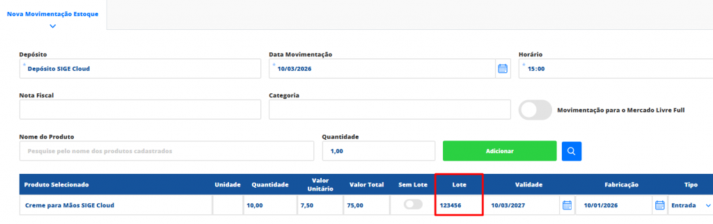 Como adicionar Saldo em Estoque de Produtos Controlados por Lote no SIGE Cloud