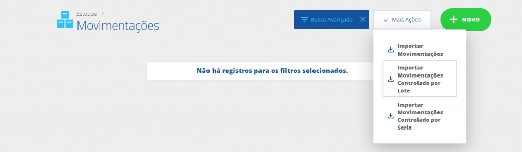 Ao acessar, clique em Mais Ações e, em seguida, Importar Movimentações Controlado por Lote.