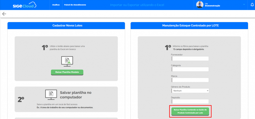 No SIGE Cloud, é possível registrar a entrada de estoque em produtos controlados por lote apenas por Movimentações Manuais ou pela Entrada de Nota Fiscal. Nesse caso, o recurso de Planilha Excel está disponível somente para a manutenção de estoque dos lotes que já estão cadastrados no sistema.