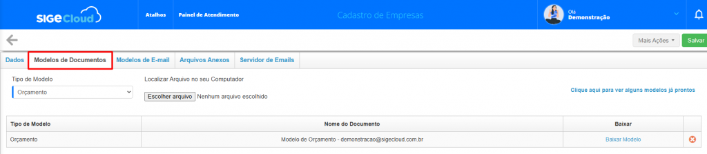 Acesse a aba Modelos de Documentos. Nessa aba, você conseguirá visualizar os modelos anexados e poderá baixá-los com a opção Baixar Modelo.