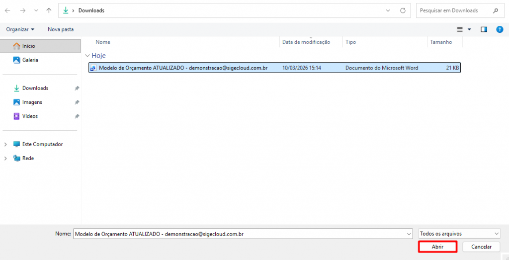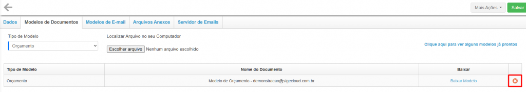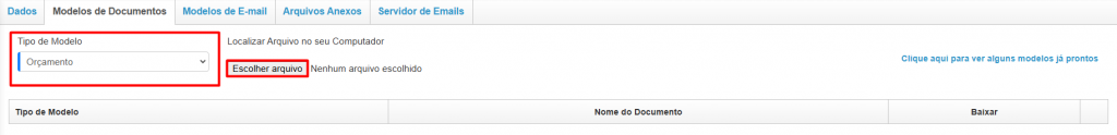 Ao remover, selecione o Tipo de Modelo correspondente (Orçamento, Pedido, Ordem de Compra…) e clique em Escolher Arquivo.