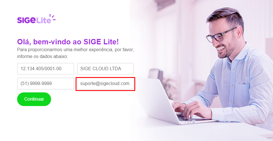 Ao realizar o primeiro login em uma conta SIGE Lite, o e-mail cadastrado na tela de dados iniciais fica registrado como e-mail administrador do contrato. Isso porque este endereço deu origem a licença juntamente com os demais dados preenchidos.