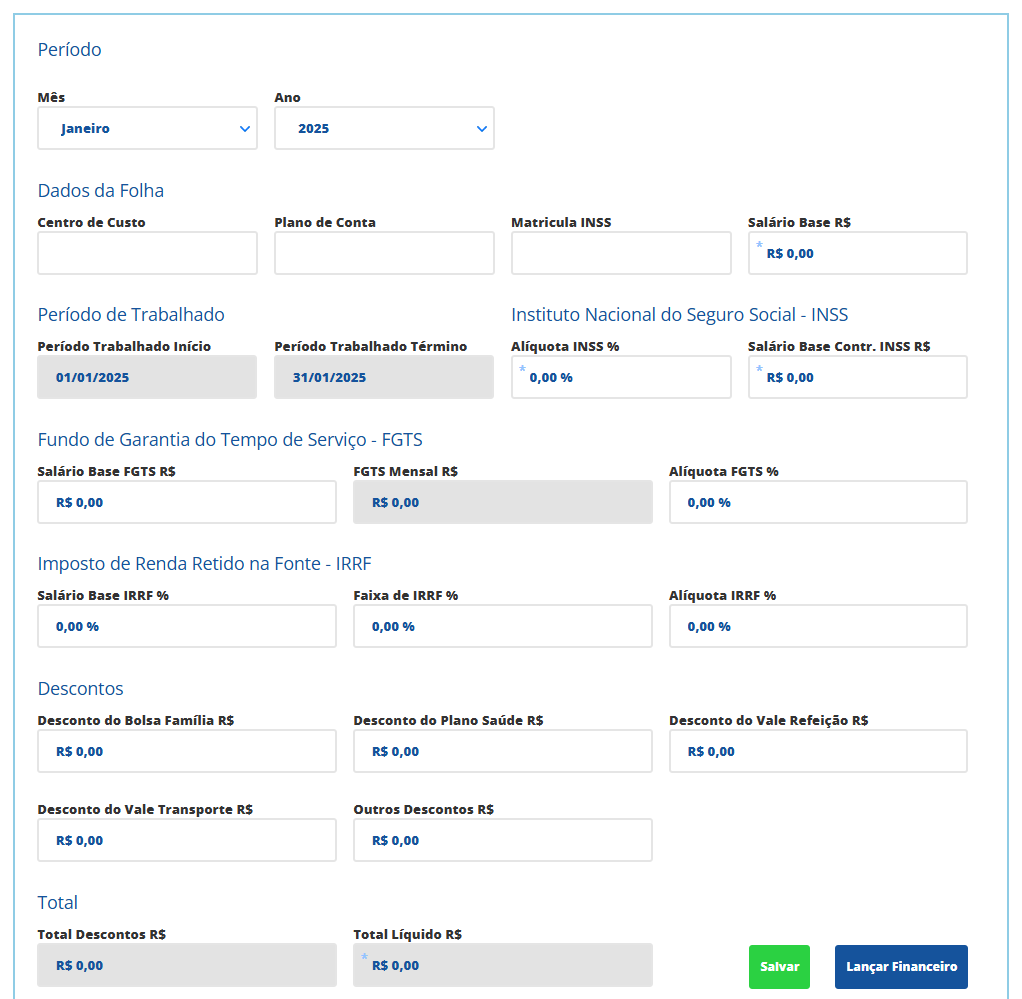 Mês: selecione o mês da folha de pagamento; Ano: selecione o ano da folha de pagamento; Centro de Custos: informe o centro de custos referente a este pagamento; Plano de Conta: informe o plano de contas referente a este pagamento; Matrícula INSS: este campo se refere à identificação do colaborador perante a Previdência Social (PIS); Salário Base R$: informe o salário de seu colaborador; Período Trabalhado Início: o sistema trará o dia de início de trabalho do colaborador de acordo com o mês selecionado; Período Trabalhado Término: o sistema trará o dia final de trabalho do colaborador de acordo com o mês selecionado; Alíquota INSS %: informe a alíquota de contribuição do INSS de seu colaborador; Salário Base Contr. INSS R$: informe o salário que deverá ser base para o cálculo do desconto do INSS, conforme a alíquota informada no campo Alíquota INSS %; Salário Base FGTS R$: informe o salário que deverá ser base para o cálculo do desconto do FGTS, de acordo com a alíquota informada no campo Alíquota FGTS %; FGTS Mensal R$: informe o valor resultante da alíquota com relação à base de cálculo do FGTS; Alíquota FGTS %: informe a alíquota de contribuição do FGTS de seu colaborador; Salário Base IRRF %: informe o salário que deverá ser base para o cálculo do desconto do IRRF (de acordo com a alíquota informada no campo Alíquota IRRF %; Faixa de IRRF %: informe a faixa que seu colaborador está, de acordo com o seu salário, para então poder definir a Alíquota IRRF que deverá ser aplicada; Alíquota IRRF %: informe a alíquota de contribuição do IRRF de seu colaborador; Desconto do Bolsa Família R$: informe o valor do desconto do Bolsa Família, se houver; Desconto do Plano Saúde R$: informe o valor do desconto do Plano de Saúde, se houver; Desconto do Vale Refeição R$: informe o valor do desconto do Vale Refeição, se houver; Desconto do Vale Transporte R$: informe o valor do desconto do Vale Transporte, se houver; Outros Descontos R$: informe o valor total de outras despesas, se houver; Total Descontos: informe o total de descontos que o seu colaborador terá em sua folha no mês citado, de acordo com os demais dados informados anteriormente, como por exemplo o INSS e FGTS. Total Líquido: o Total Líquido é o valor que efetivamente seu colaborador irá receber.