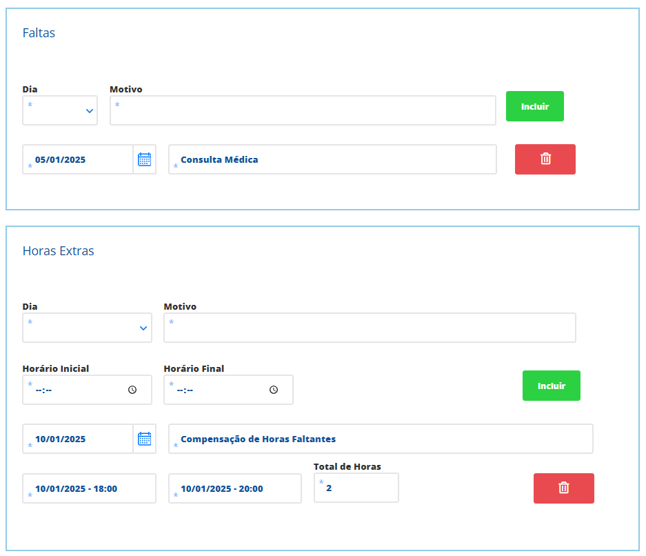 Faltas: nesta aba informe o dia de faltas que o colaborador teve no período, tendo também que informar o motivo das faltas. Lembrando que este campo é apenas informativo. Horas Extras: nesta aba informe as horas extras realizadas pelo seu colaborador, estas informações também são apenas para registro, pois não serão consideradas para cálculos da folha.