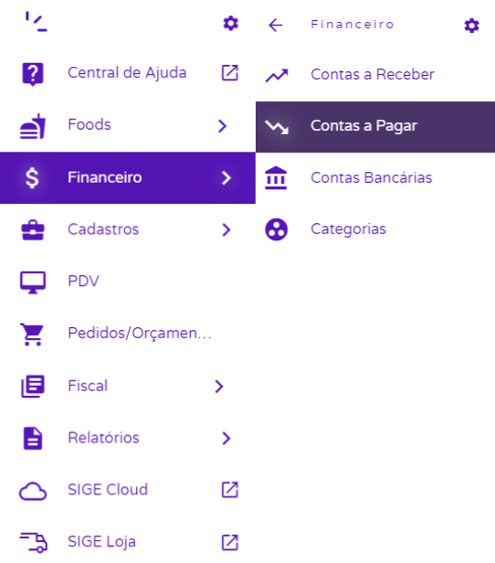 Para isso, acesse o menu lateral Financeiro e submenu Contas a Pagar.