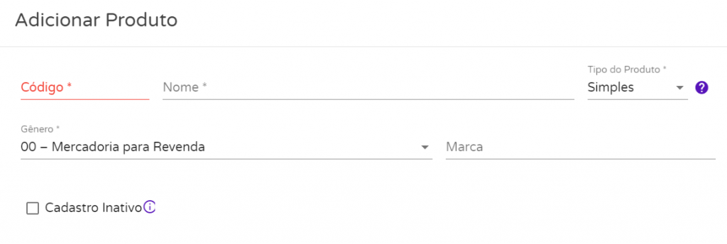 Tipo do Produto*: defina o tipo de produto que está cadastrando. Nesse caso, será Simples;