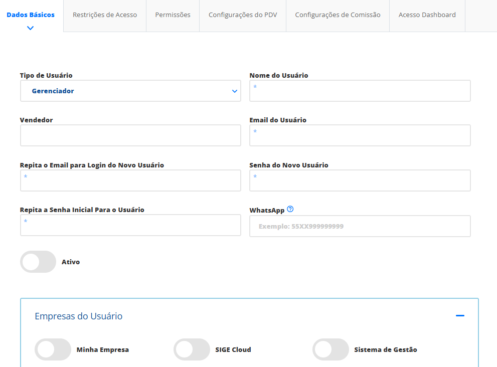 Assim, o sistema apresentará uma nova tela com diversos campos para a identificação e permissões do novo usuário.