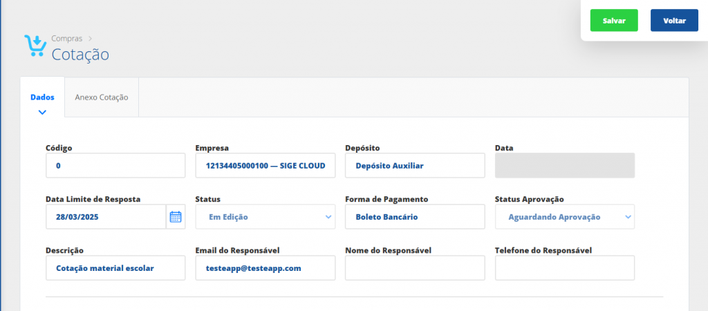 E-mail do Responsável: preencha com o e-mail do responsável pela Cotação;