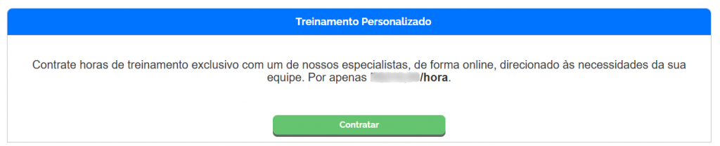 Assim, o sistema apresentará uma nova tela, onde você deverá buscar pela seção Treinamento Personalizado. Ali, será apresentado o valor do recurso, caso queira contratar, basta clicar em Contratar.