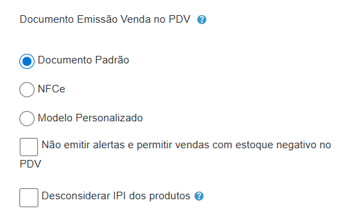 A partir de agora, com os campos abaixo você poderá definir o documento que será emitido pelo seu PDV.