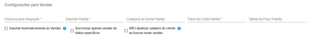 Empresa para integração: informe o nome da empresa que está cadastrada no sistema, a qual irá receber os pedidos na Bis2Bis; Depósito Padrão: informe o depósito padrão de onde os produtos darão baixa do estoque ao realizar a venda na Bis2Bis; Categoria de Venda Padrão: informe a categoria que será padrão na sua venda. Essa informação é vinculada às operações fiscais dos seus produtos. Normalmente é utilizada a categoria “Venda de Materiais e Serviços”; Plano de Conta Padrão: informe o plano de contas de receita que será informado na conta a receber quando for realizada uma venda na Bis2Bis; Tabela de Preço Padrão: se desejar, informe uma tabela de preço que serão atribuídos os preços de venda em seus produtos na Bis2Bis; Importar Automaticamente as Vendas: marque se deseja que o sistema busque as vendas automaticamente na plataforma integrada; Sincronizar Automaticamente Vendas Canceladas: habilite esta opção se deseja que as vendas canceladas na Bis2Bis sejam importadas no SIGE Cloud de forma automática; Sincronizar apenas vendas de status específicos: poderá selecionar os status de venda desejados na importação de novas vendas.