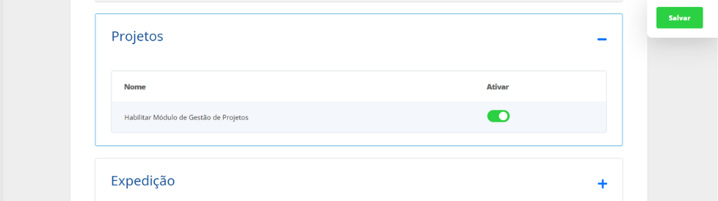 No entanto, é importante destacar que o menu Gestão de Projetos só ficará disponível após ser habilitado em Configurações > Configurações do ERP, dentro da seção “Projetos”, marcando a opção “Habilitar Módulo de Gestão de Projetos”.
