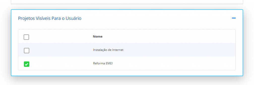 Dentro do cadastro de cada usuário, você encontrará duas seções principais relacionadas à Gestão de Projetos: