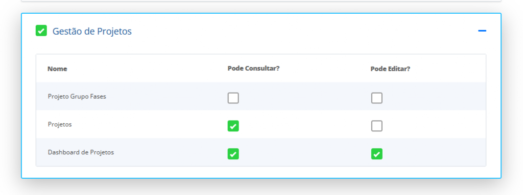 Em Permissões determine quais submenus do menu Gestão de Projetos o usuário poderá acessar (Projetos, Dashboard e Grupo de Fases), permitindo controlar se ele terá apenas acesso de visualização ou também poderá cadastrar e editar informações.