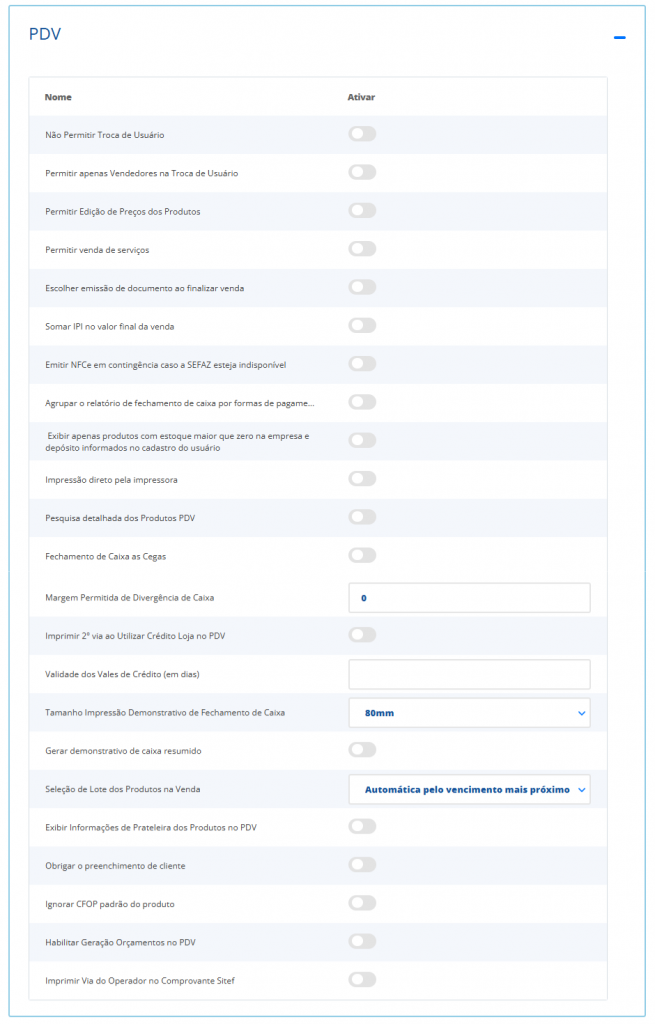 Seleção de Lote dos Produtos na Venda: ao habilitar esta opção, você poderá escolher o Lote do produto que será vendido no momento da venda;