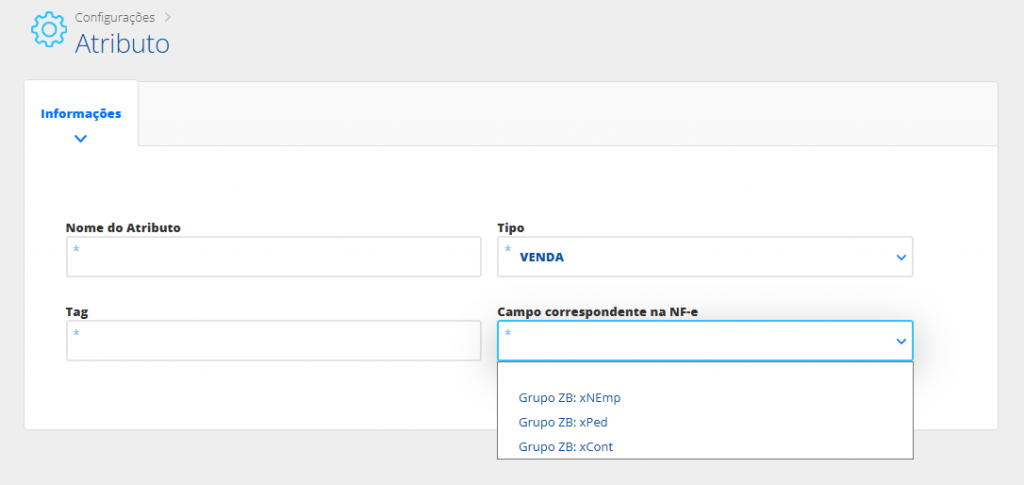 Campo correspondente na NF-e: o sistema permite que, com as informações inseridas nesse campo na Venda, automaticamente sejam repassadas para o XML da NF-e, gerada através da venda. Você pode selecionar para Informações de Compra (Grupo ZB), selecionando entre xNEmp (Nota de Empenho), xPed (informações sobre o pedido) e xCont (informações sobre o contrato da compra).