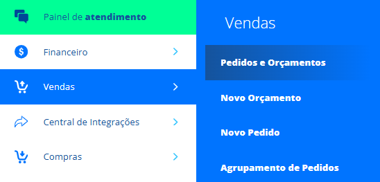 Acesse o menu lateral Vendas, submenu Pedidos e Orçamentos. Na listagem, acesse um Orçamento/Pedido já cadastrado para editá-lo ou clique em +NOVO para cadastrar um novo orçamento/pedido.
