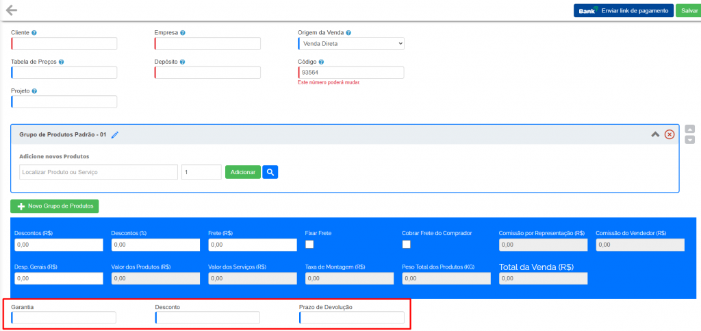 Caso você tenha selecionado o Tipo “Venda“, o sistema exibirá um novo campo: