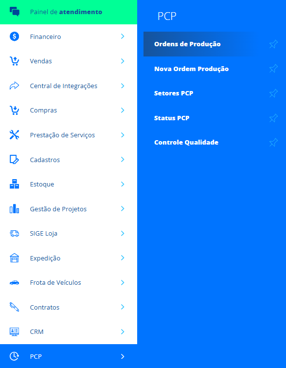 Acesse o menu lateral PCP, submenu Ordens de Produção. Na listagem, acesse uma OP já cadastrada para editá-la ou clique em +NOVO para cadastrar uma nova OP.
