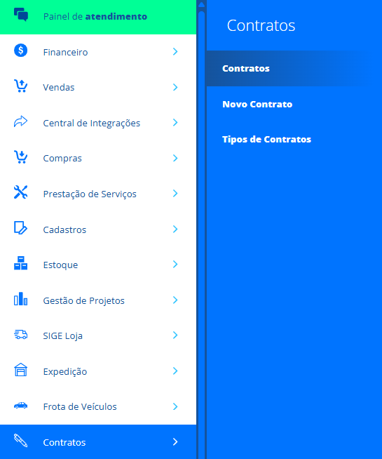 Acesse o menu lateral Contratos, submenu Contratos. Na listagem, acesse um contrato já cadastrado para editá-lo ou clique em +NOVO para cadastrar um novo contrato.