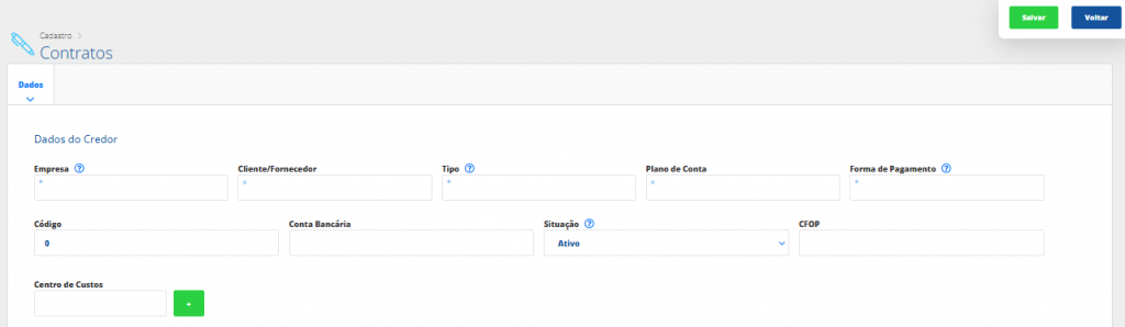 Código: você poderá informar um código para este contrato, caso não seja preenchido, o sistema irá preencher este campo ao salvar;