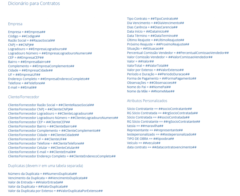 O Dicionário para contratos é uma ferramenta que irá lhe auxiliar durante a construção do seu contrato personalizado. Ele funciona através da utilização de TAGs, onde você deve colocar a TAG que deseja para que ela seja lida e substituída pela informação cadastrada no sistema.