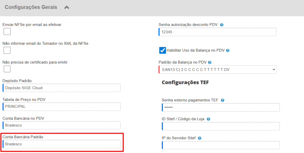 Como definir a Conta Bancária Padrão da empresa no SIGE Cloud