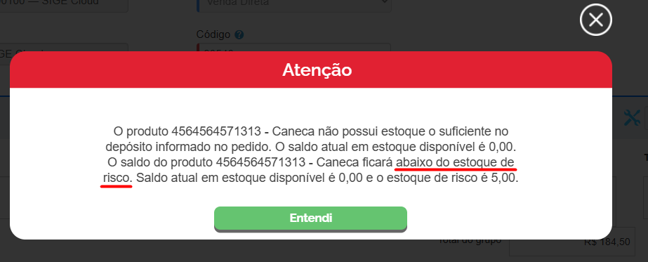 No campo Estoque de Risco, informe a quantidade na qual deseja que o sistema bloqueie a venda deste produto. Assim, você receberá uma notificação que seu item atingiu o limite imposto por você, como por exemplo: o produto Caneca tem o estoque de risco de cinco unidades. Assim, somente poderá haver vendas deste item até ele atingir esse limite. Quando isto acontecer, uma notificação será enviada no momento em que este item for adicionado na venda, e consequentemente bloqueará a finalização da mesma.