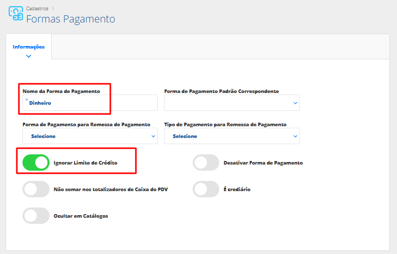 Importante! O sistema irá utilizar as formas de pagamento para contabilizar o uso do limite de crédito, portanto, se atente ao cadastro das formas de pagamento.
