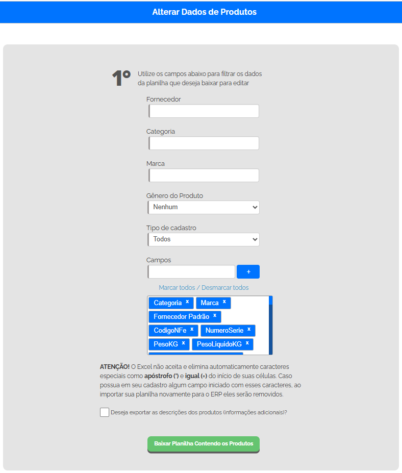 Atenção! Caso deseje filtrar os produtos por alguma informação específica, utilize os filtros disponíveis: Fornecedor, Categoria, Marca, Gênero ou Tipo. Se nenhum filtro for aplicado, o sistema buscará todos os itens cadastrados e todos eles serão incluídos na planilha para edição.