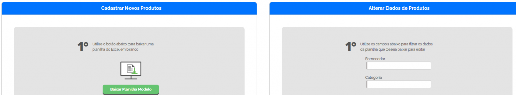 Ao selecionar, o sistema exibirá duas colunas, cada uma com sua função: Cadastrar Novos Produtos e Alterar Dados de Produtos (já cadastrados).