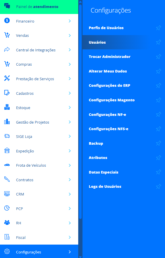 Acesse menu lateral Configurações, submenu Usuários.