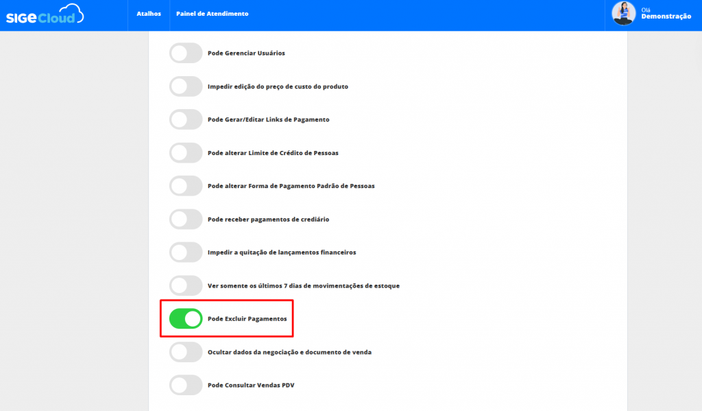 Depois dessa configuração, tanto o administrador quanto o usuário poderão excluir pagamentos. Saiba mais em: Como excluir Pagamentos no SIGE Cloud.