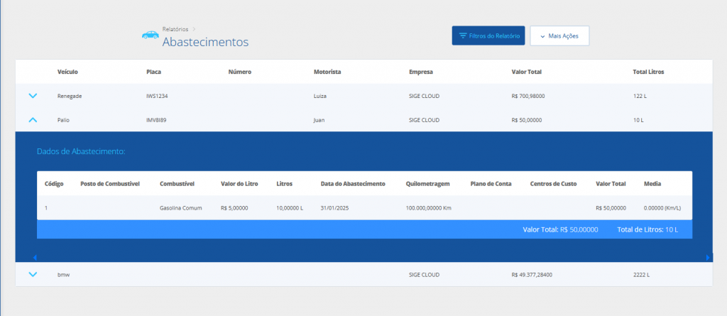 No relatório de Abastecimentos você visualizará todos os abastecimentos que foram criados para cada um de seus veículos da Frota de Veículos. O relatório permitirá uma simples visualização das principais informações de cada abastecimento, como valor, quilometragem do veículo, quantidade de litros abastecidos, data, entre outros.
