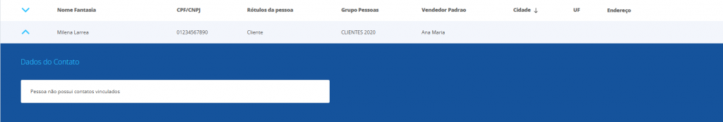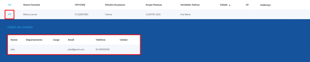 Além disso, ao clicar no ícone de expandir, também será possível visualizar os Dados dos Contatos da pessoa, se houver.