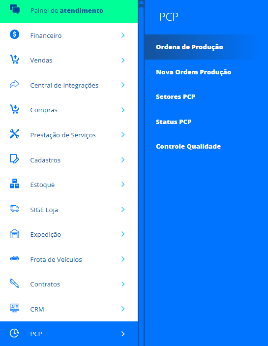 Acesse o menu lateral PCP, submenu Nova Ordem de Produção e crie a sua Ordem de Produção.