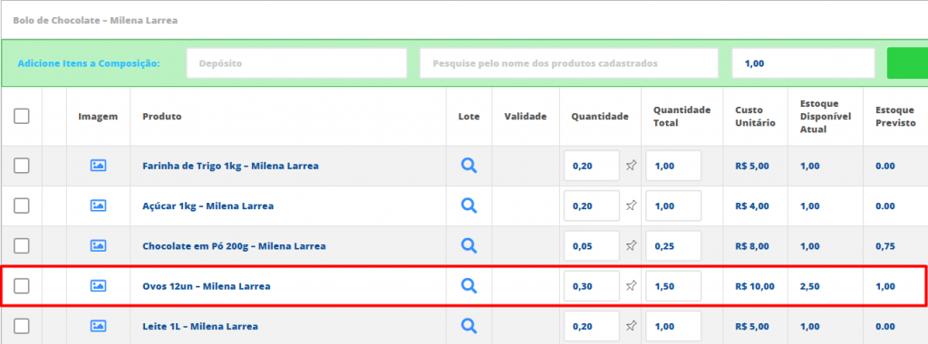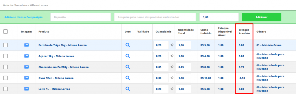 Nesta tela, estará disponível a coluna Estoque Previsto, que apresentará a quantidade em que o estoque das composições ficará após a baixa dos itens compostos durante a produção dessa mercadoria.
