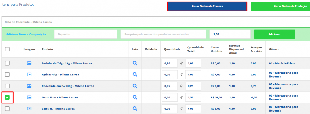 Caso uma das matérias-primas não possua saldo suficiente para a fabricação, selecione-a e clique na opção Gerar Ordem de Compra.