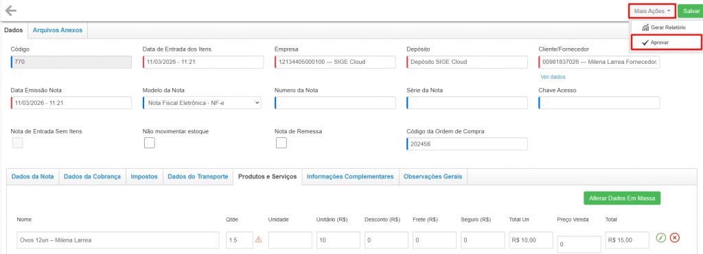 Na mesma tela, clique em Mais Ações, opção Aprovar. Caso também deseje gerar Conta a Pagar dessa compra, clique novamente em Mais Ações, opção Faturar.