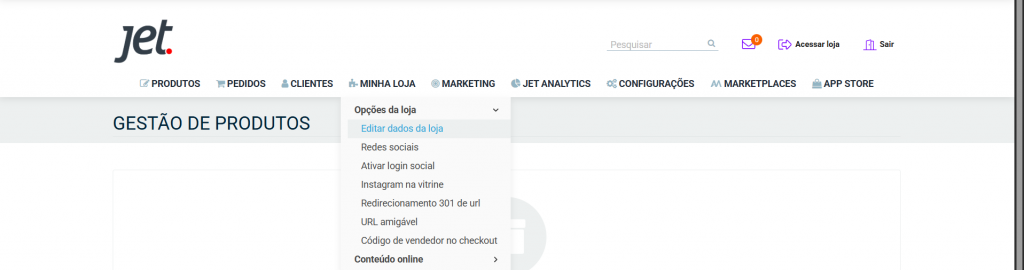 Agora, as demais informações serão encontradas diretamente na sua conta da Jet NEO. Ao acessá-la, clique em Configurações e em seguida em Dados da Loja.