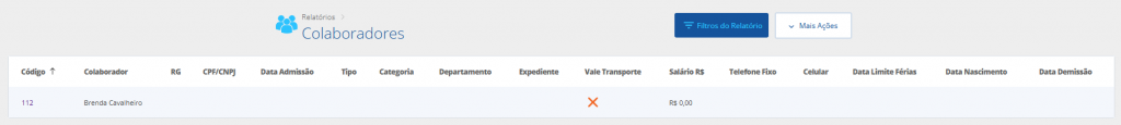 Este relatório mostrará uma listagem de todos os colaboradores cadastrados no módulo de Recursos Humanos, e as informações competentes à eles.