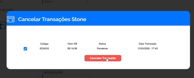 Na janela Cancelar Transações Stone, selecione a transação desejada e clique em Cancelar Transação.