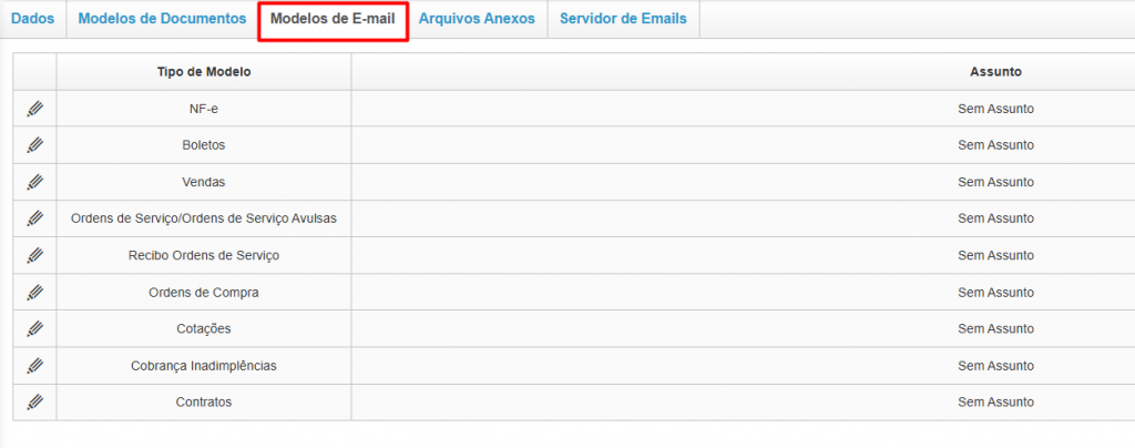 Logo após, dirija-se à aba Modelos de E-mails. Nesta tela terá a coluna Tipos de Modelo e Assunto, onde você poderá escolher qual tipo de documento você quer personalizar o e-mail a ser enviado ao cliente. Após escolher, clique em Editar, no lápis.