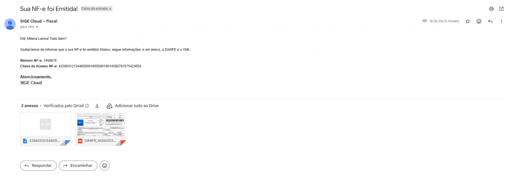 No caso da NF-e foi anexado automaticamente ao e-mail, o arquivo XML e a DANFE da nota.