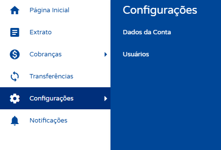 Para isso, acesse sua conta SIGE Bank e acesse o menu lateral Configurações, submenu Dados da Conta.