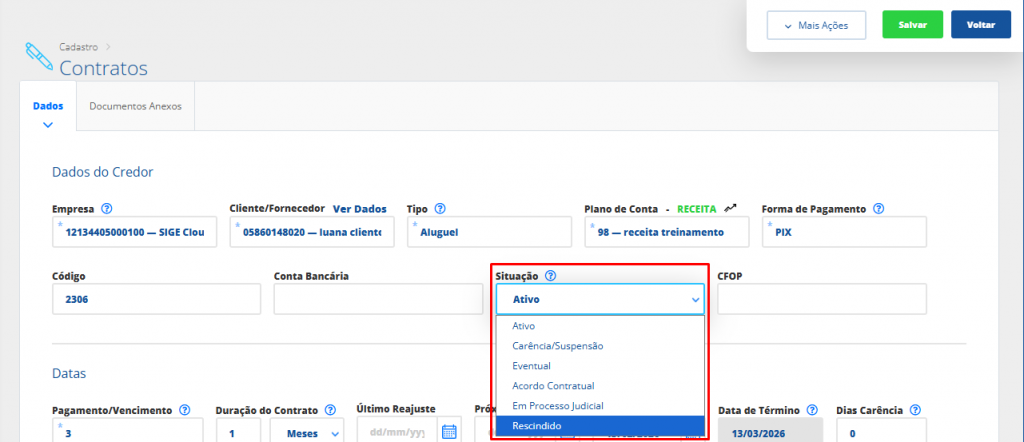 Status: aqui informe o status no qual o contrato se encontra;