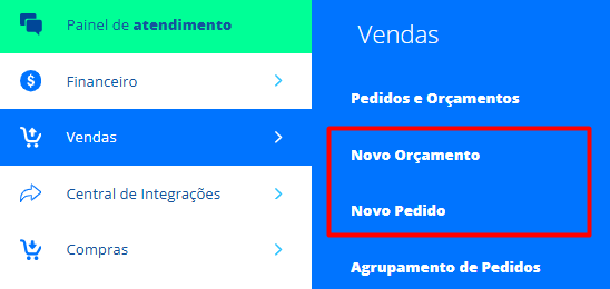 Acesse o menu lateral Vendas, submenu Pedidos e Orçamentos, em seguida clique na opção +Novo.