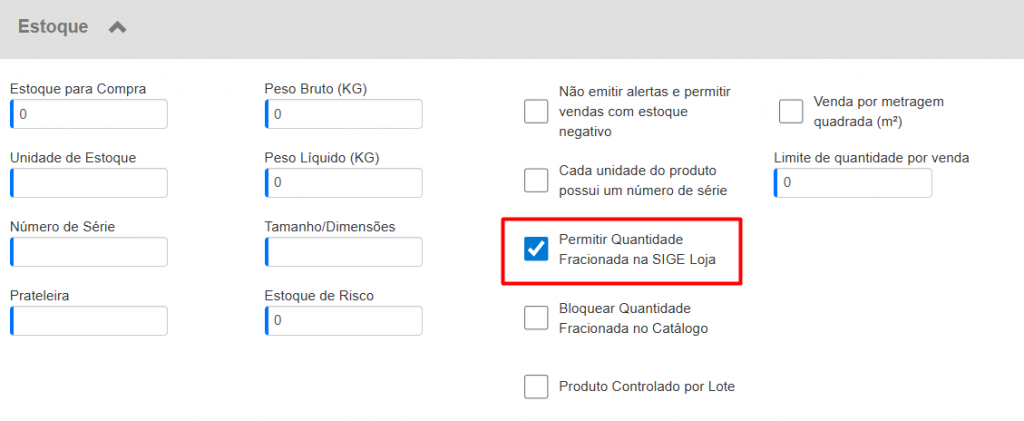 Agora, na edição do produto, na aba Dados, role a tela até a seção Estoque e expanda. Feito isso, você verá a opção Permitir Quantidade Fracionada na SIGE Loja, a qual deverá habilitar. Depois disso, clique em Salvar no topo da tela.