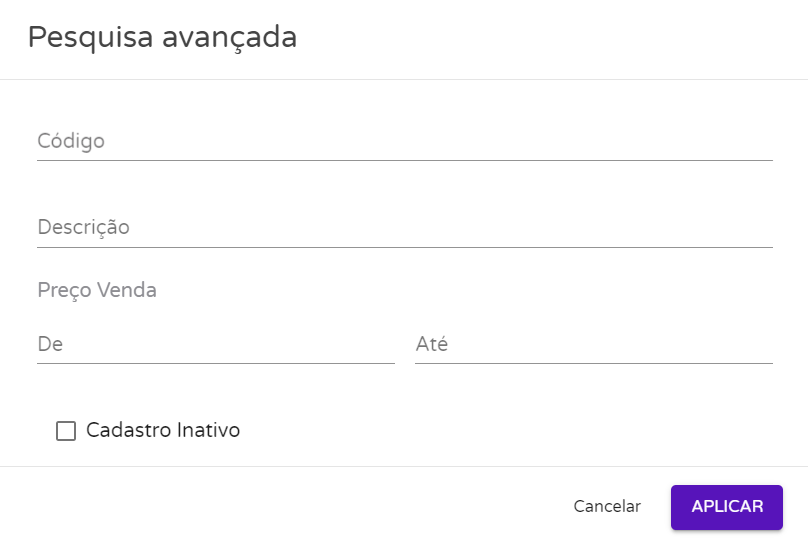 Filtrar: nesta opção, será possível buscar um serviço de forma mais específica, pelo Código, Descrição, Preço de Venda e Cadastro Inativo;