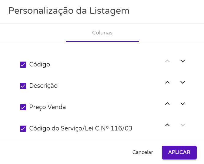 Colunas (ícone): nesta opção, será possível personalizar a tela da listagem, removendo, adicionando ou alterando a ordem das colunas disponível da visualização.